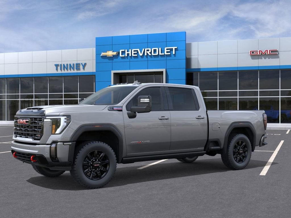 This 2026 GMC Sierra 2500HD AT4 Crew Cab 4WD in Sterling Metallic is powered by a Duramax 6.6L V8 turbodiesel engine and a 10-speed automatic transmission, delivering impressive towing and off-road capability. The X31 Off-Road Package, Max Trailering Package, and Gooseneck/5th Wheel Prep Package make this Sierra ready for tough jobs and adventures.