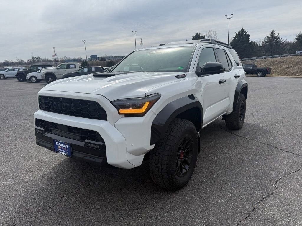 This 1-owner, accident-free, local trade 2025 Toyota 4Runner i-FORCE MAX Hybrid TRD Pro in Ice Cap offers impressive efficiency and capability with its 2.4L turbocharged hybrid engine, 4WD, and 8-speed automatic transmission, delivering 23 city/24 highway MPG.Inside this 4Runner TRD Pro, you'll find Black SofTex-trimmed seats with both heating and ventilation for the front buckets, plus power adjustments and memory settings. The cabin features a 14-inch audio system touchscreen with 15 speakers, Apple CarPlay/Android Auto, SiriusXM, navigation, dual-zone climate control, remote keyless entry, and a split folding rear seat for added versatility.Safety and convenience are highlighted by active cruise control, an exterior parking camera, auto high-beam headlights, heated mirrors, and a security system, giving you confidence on every drive.The exterior stands out with 18-inch matte-black TRD alloy wheels, TRD Pro styling, front fog lights, and power mirrors, making this 4Runner both rugged and refined for any adventure.